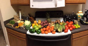 1 pineapple, 1 cantaloupe, 2 lbs red potatoes, 2 lbs onions, 3 corn, 1 cauliflower, 1 broccoli,